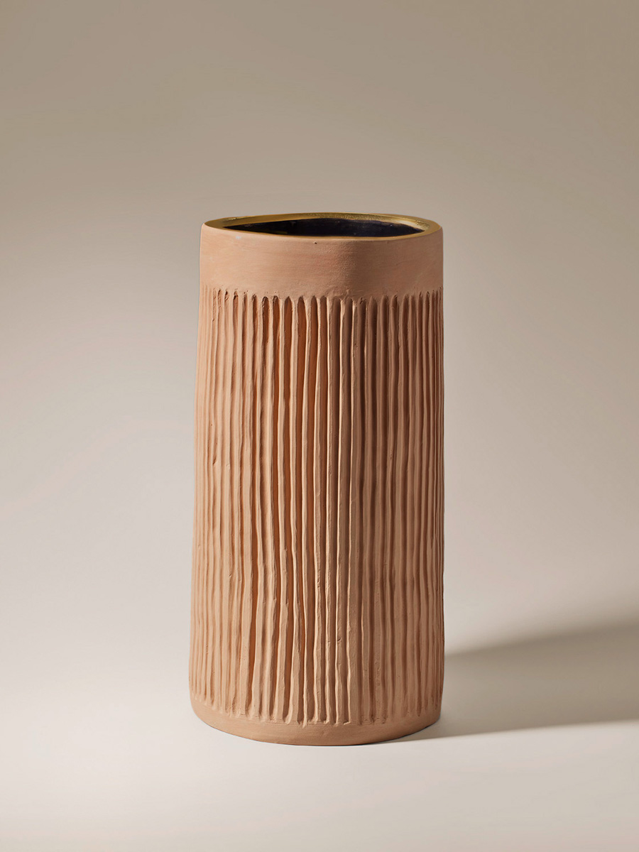 Roter Ton, abgebaut in Einsiedeln in derSchweiz. Strukturierte Linien, Öffnung mit dünnem Echtgoldrand. Innen schwarz glänzend glasiert.