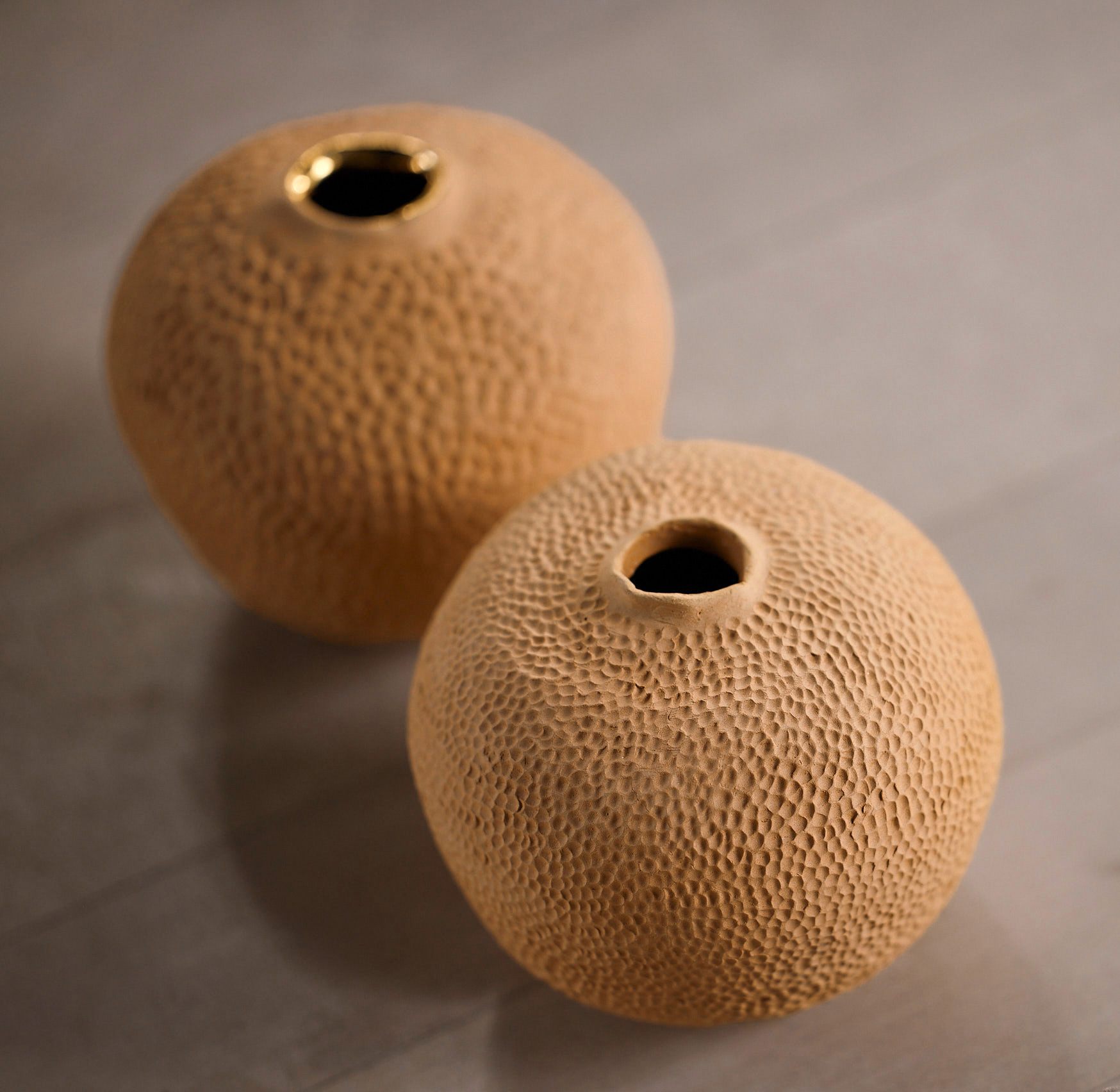 Roter Ton, abgebaut in Einsiedeln in der Schweiz. Strukturierte Vertiefungen. Innen glasiert, teilweise mit dünnem Goldrand.