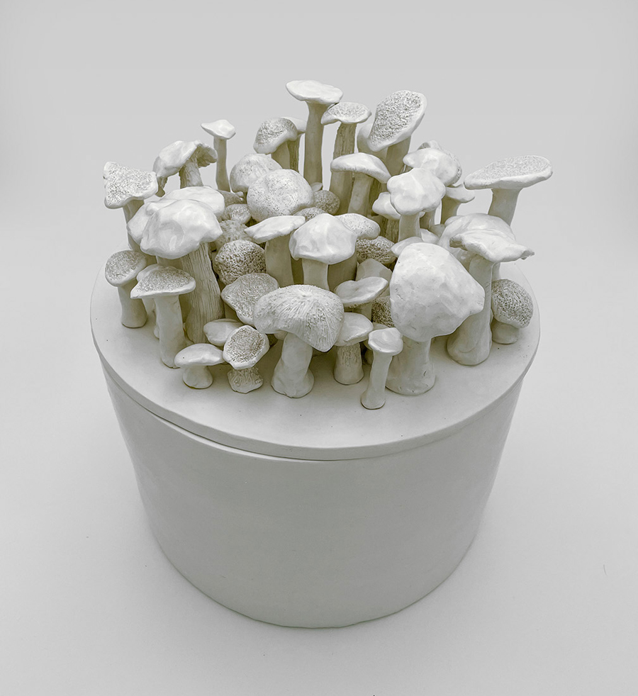 Handgefertigte Dosen. Jeder Pilz auf dem Deckel ist einzeln modelliert und hochglänzend glasiert. Die Dose ist matt glasiert.