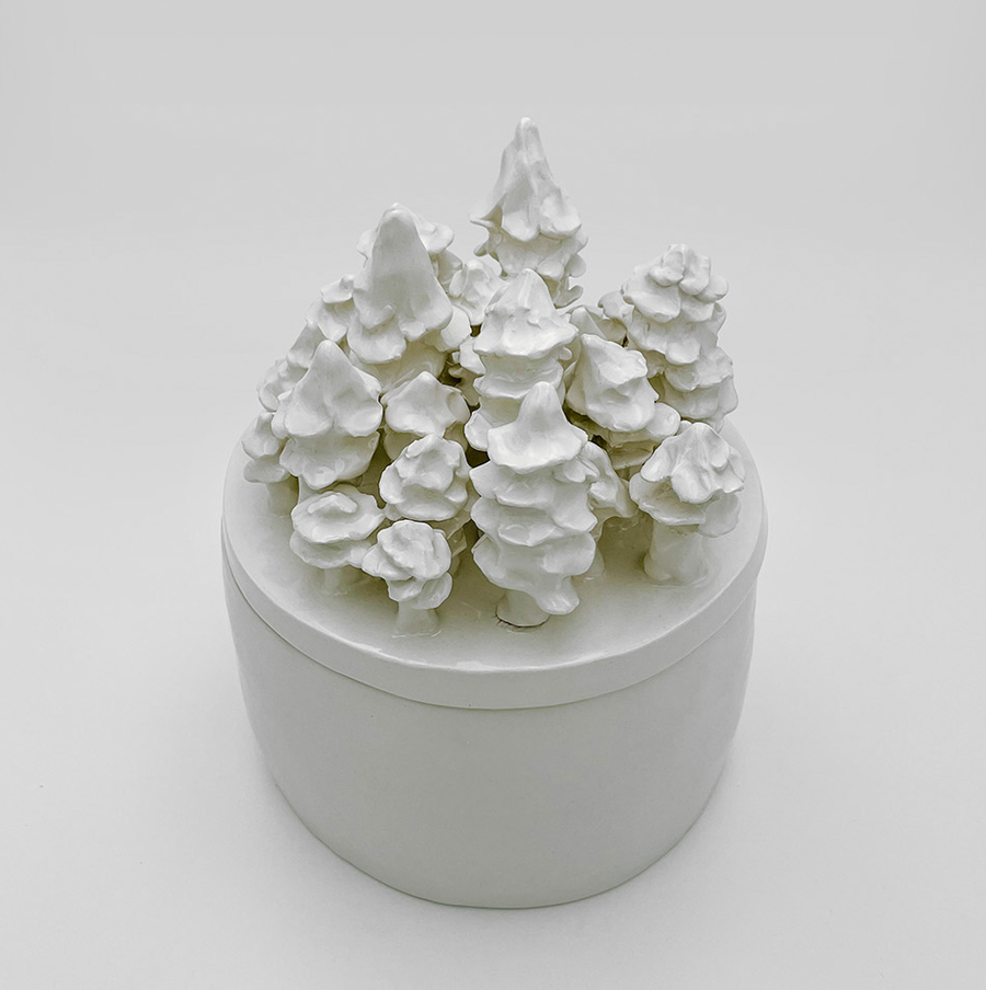 Handgefertigte Dose. Jeder Tannenbaum auf dem Deckel ist einzeln modelliert und hochglänzend glasiert. Die Dose ist matt glasiert.